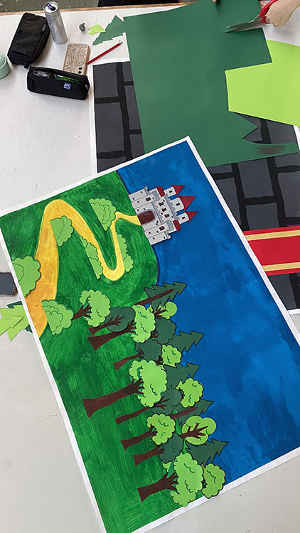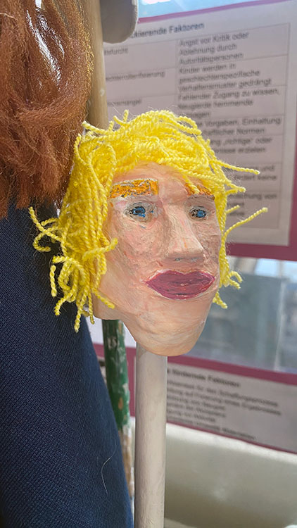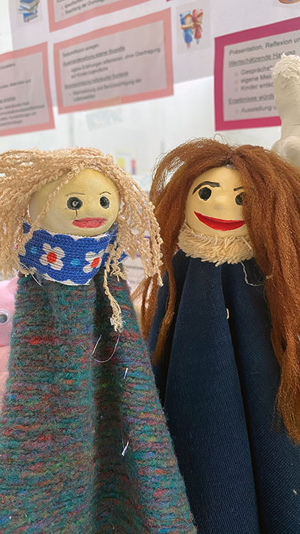 Auf dieser Grundlage entstehen nun mit viel Engagement und Liebe zum Detail die passenden Handpuppen, Requisiten und Bühnenbilder. Kleine Schweinchen, Hänsel und Gretel oder auch der Froschkönig werden plastisch gestaltet – es wird gemalt, gezeichnet, genäht und geklebt.